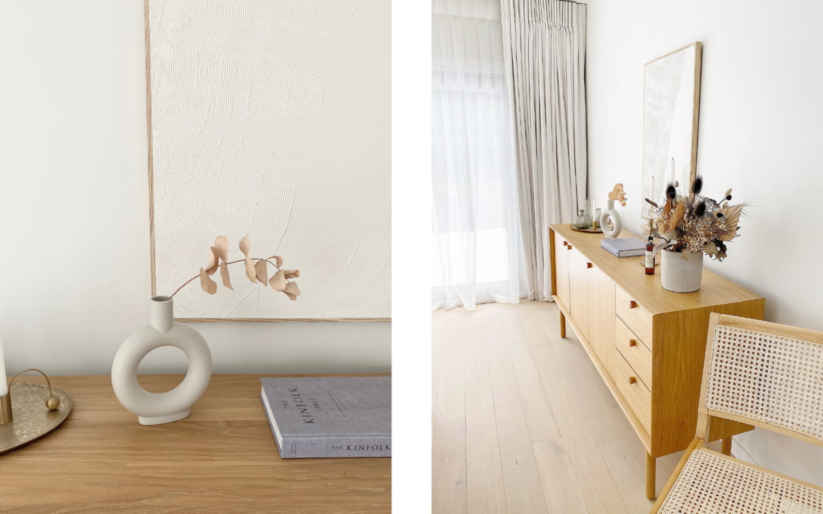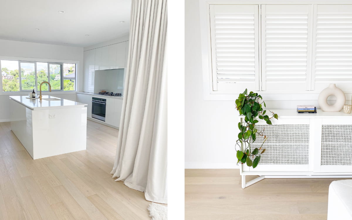 "Our style is described as minimal and calm. We always feel so relaxed in our space. We wanted a home that was spacious for ourselves but also great for entertaining. We both love our open plan dining/living/kitchen area. Our vision for this home was neutral, calm, warm and comfortable. Our style is 1950’s Minimalist come Mid-Century Modern. Our design inspiration came from modern Scandinavian-inspired kitchens. The cool/warm tone of the floor paired well with the simple white cabinetry, minimal white backsplash and 20mm quantum quartz white stone benchtop."